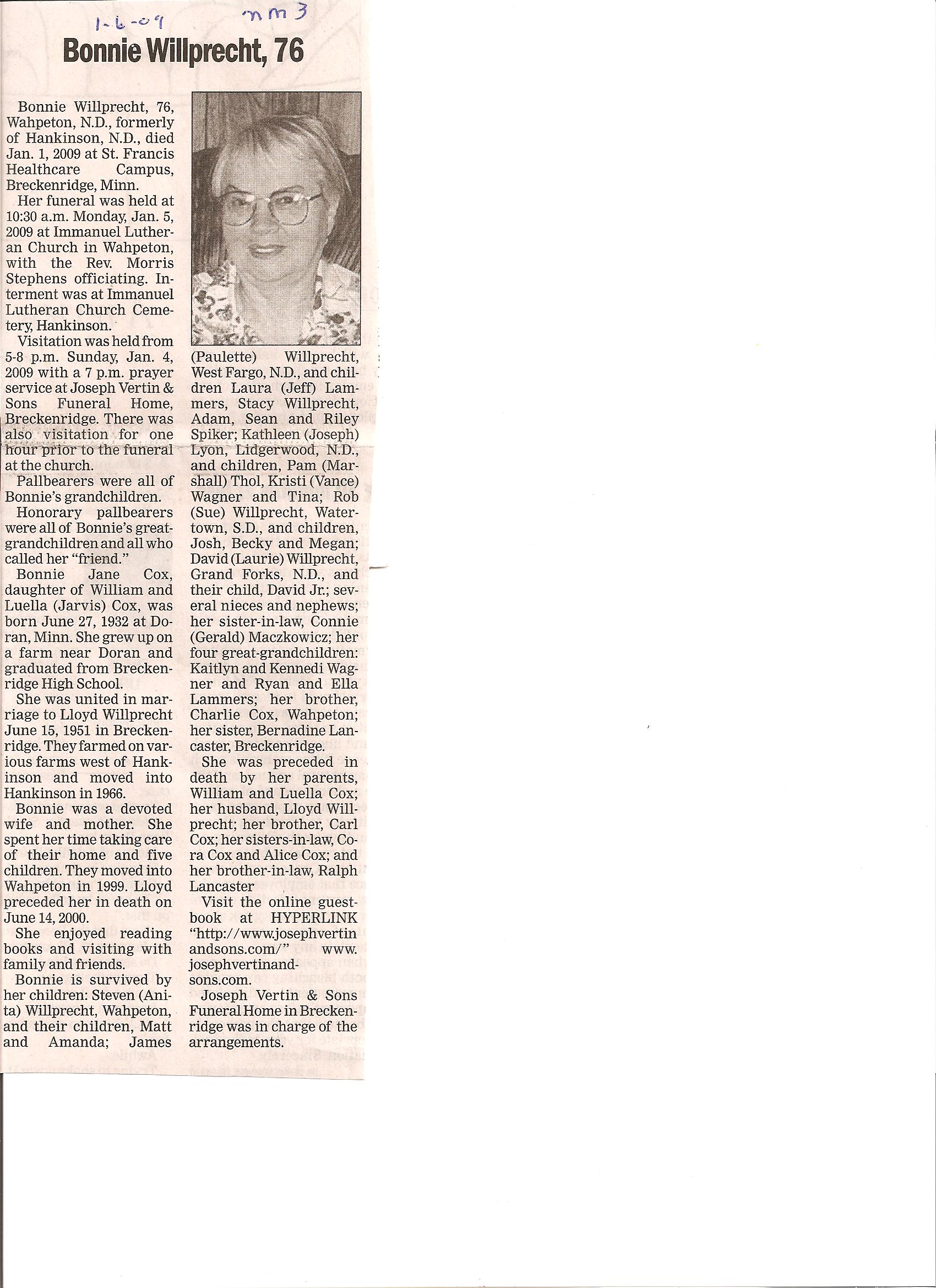 | WILLPRECHT (COX), Bonnie Jane | 1932/06/27 | 2009/01/01 | // | // | Obit | WITT, Frank WITT (STOPPELMAN), Louise (2nd Wife)(1st wife was Augusta Ziegelman,Pratt) Frances Ehler (3rd Wife) Died in North Field, MN in 1971 | 1877/06/27 1883/10/11 | 1947/06/29 1923/05/10 | Photo | // | // |