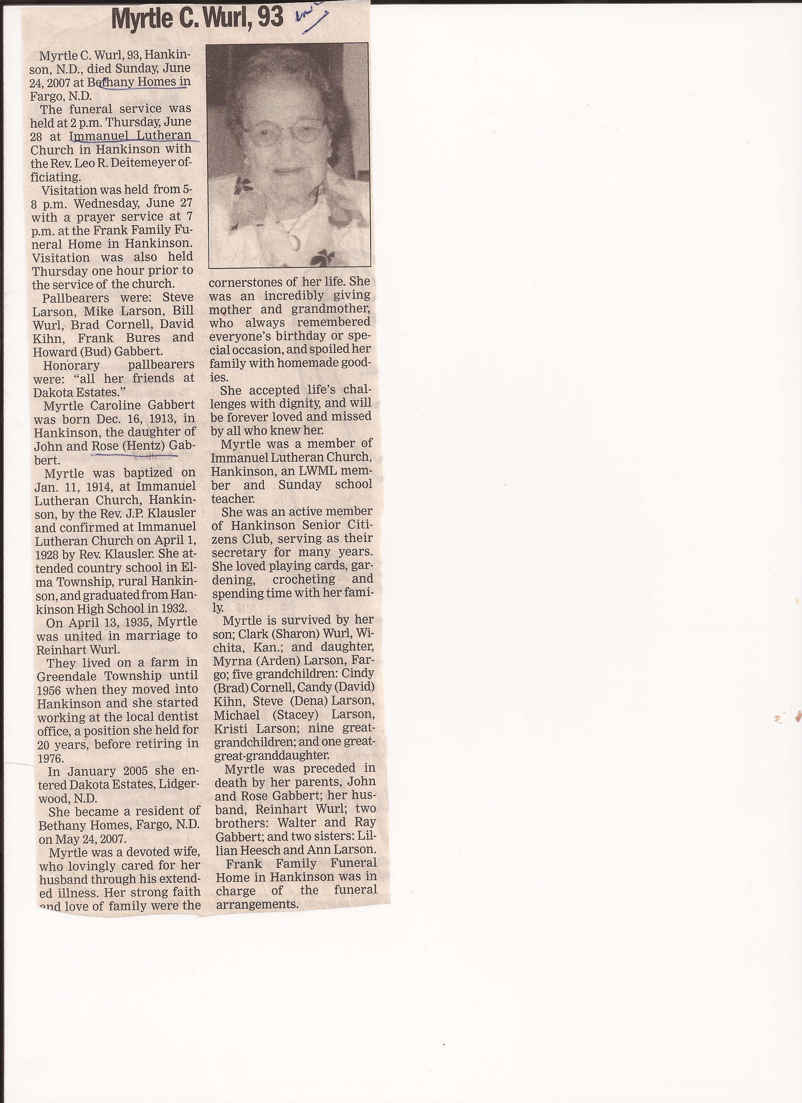 | WURL, Myrtle Caroline | 1914/01/11 | 2007/06/24 | // | // | Obit | ||||||