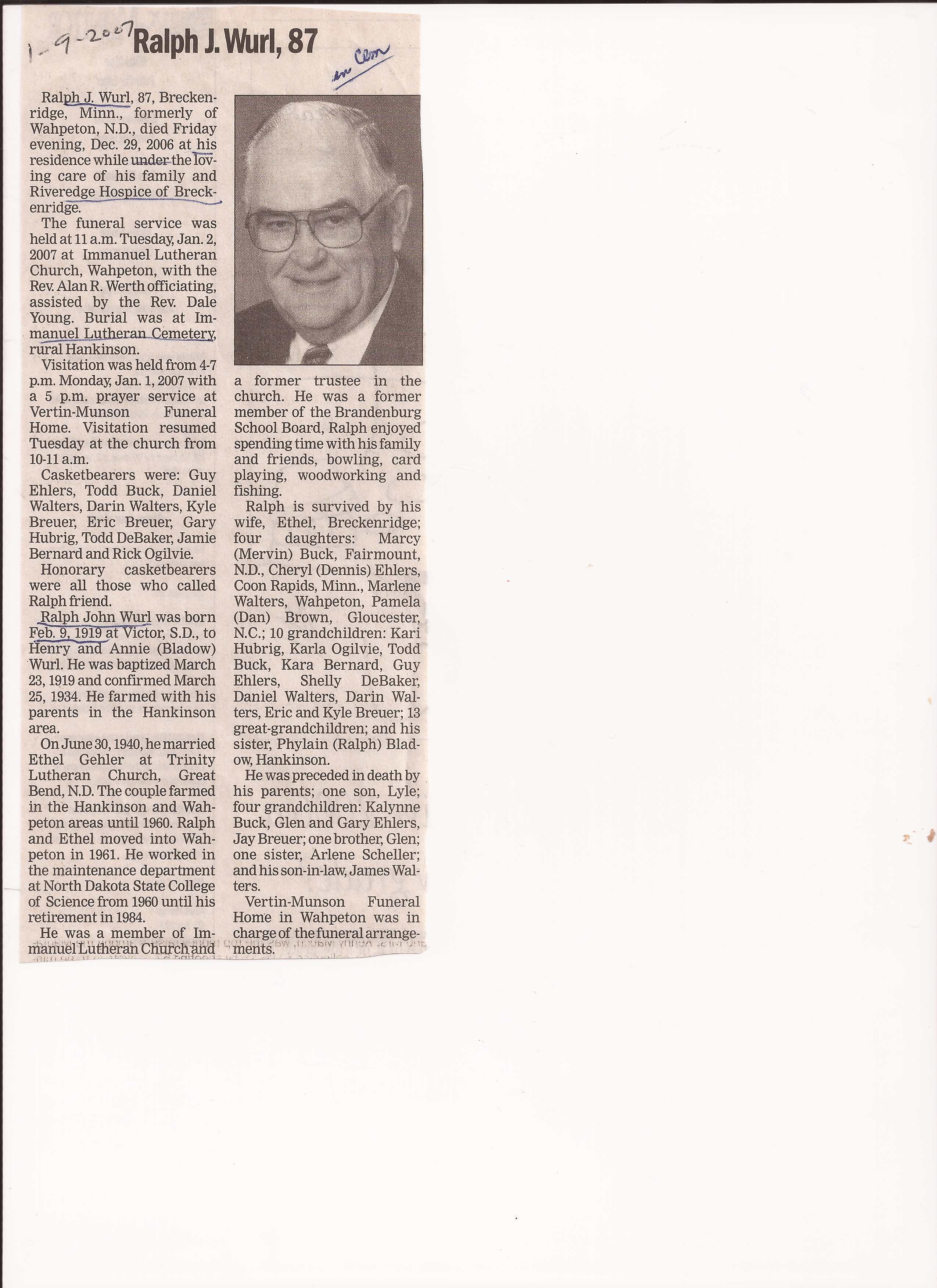 | WURL, Ralph John | 1919/02/09 | 2005/12/20 | // | // | Obit |