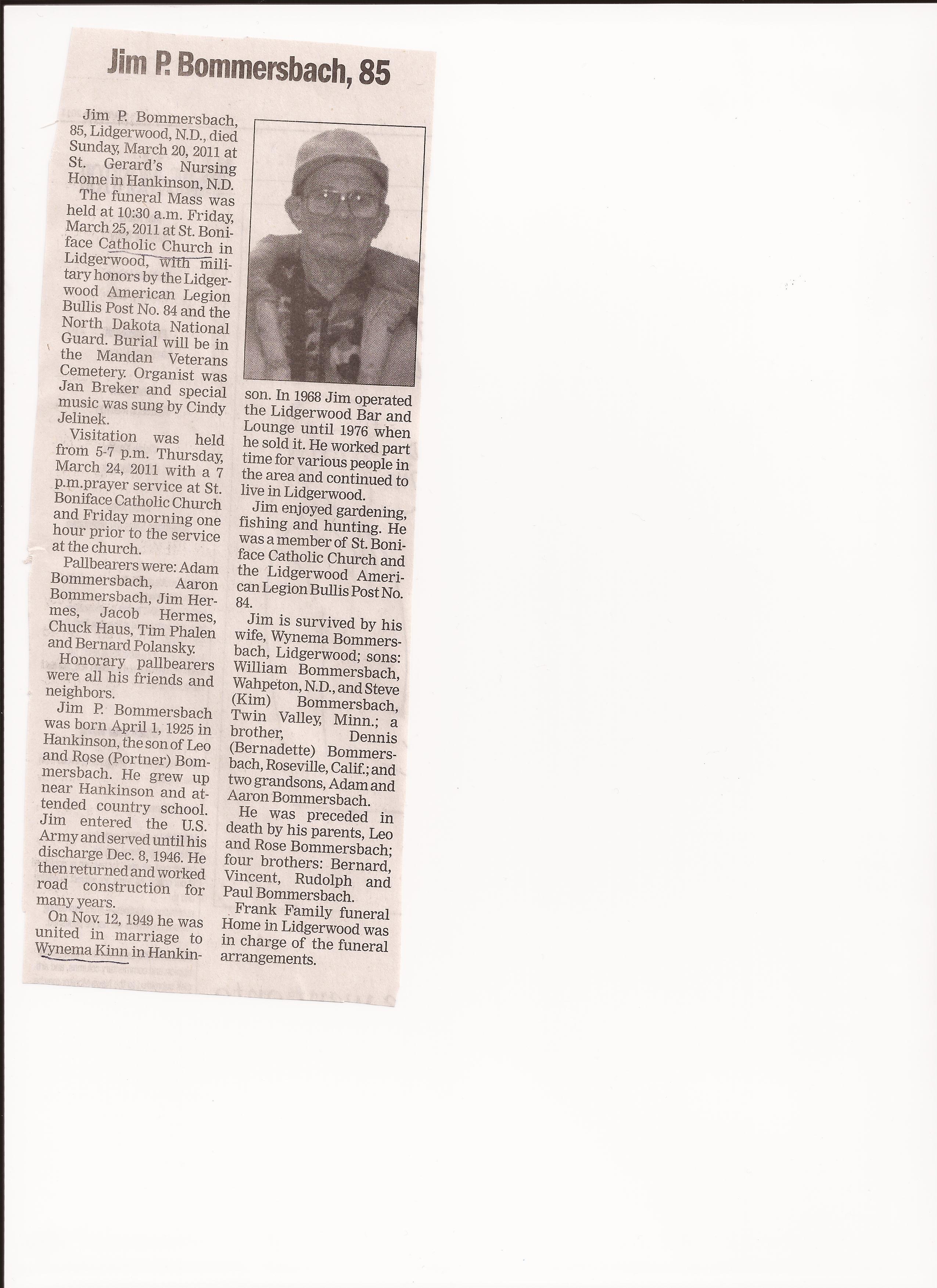 | BOMMERSBACH, Jim P. | 1925/04/01 | 2011/03/20 | St. Gerard's Nursing Home, Hankinson | // | // | Obit | // |