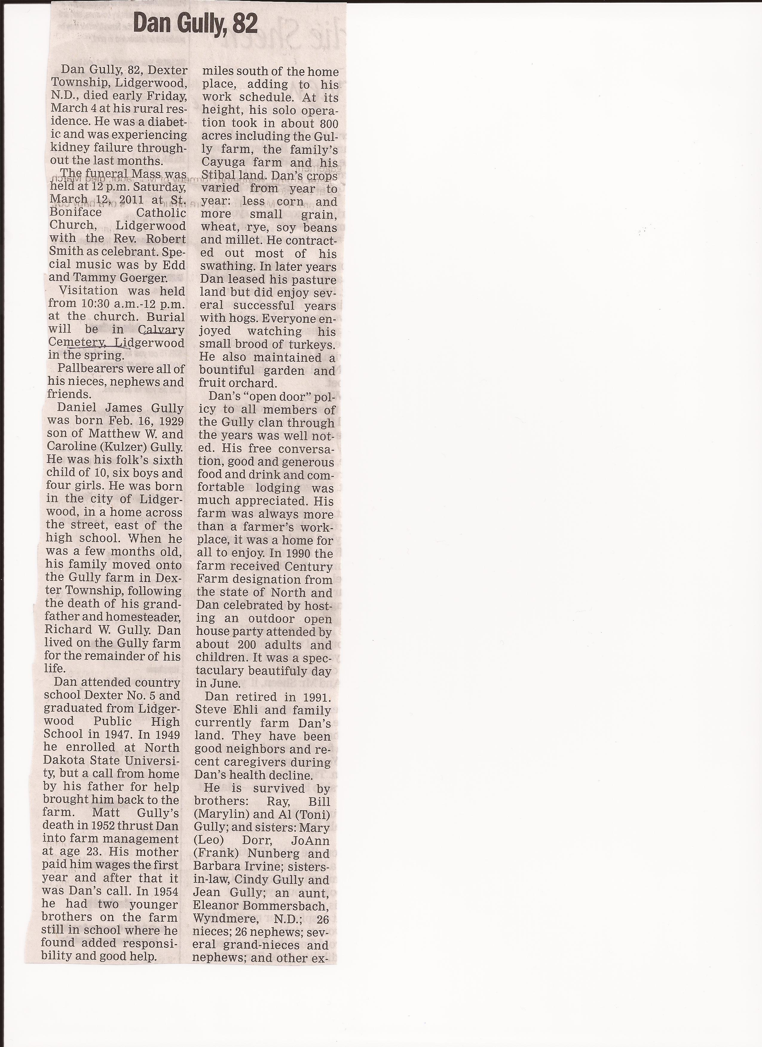 | GULLY, Dan, 82 | 1929/02/16 | 2011/03/04 | His rural Residence | // | // | Obit | // |