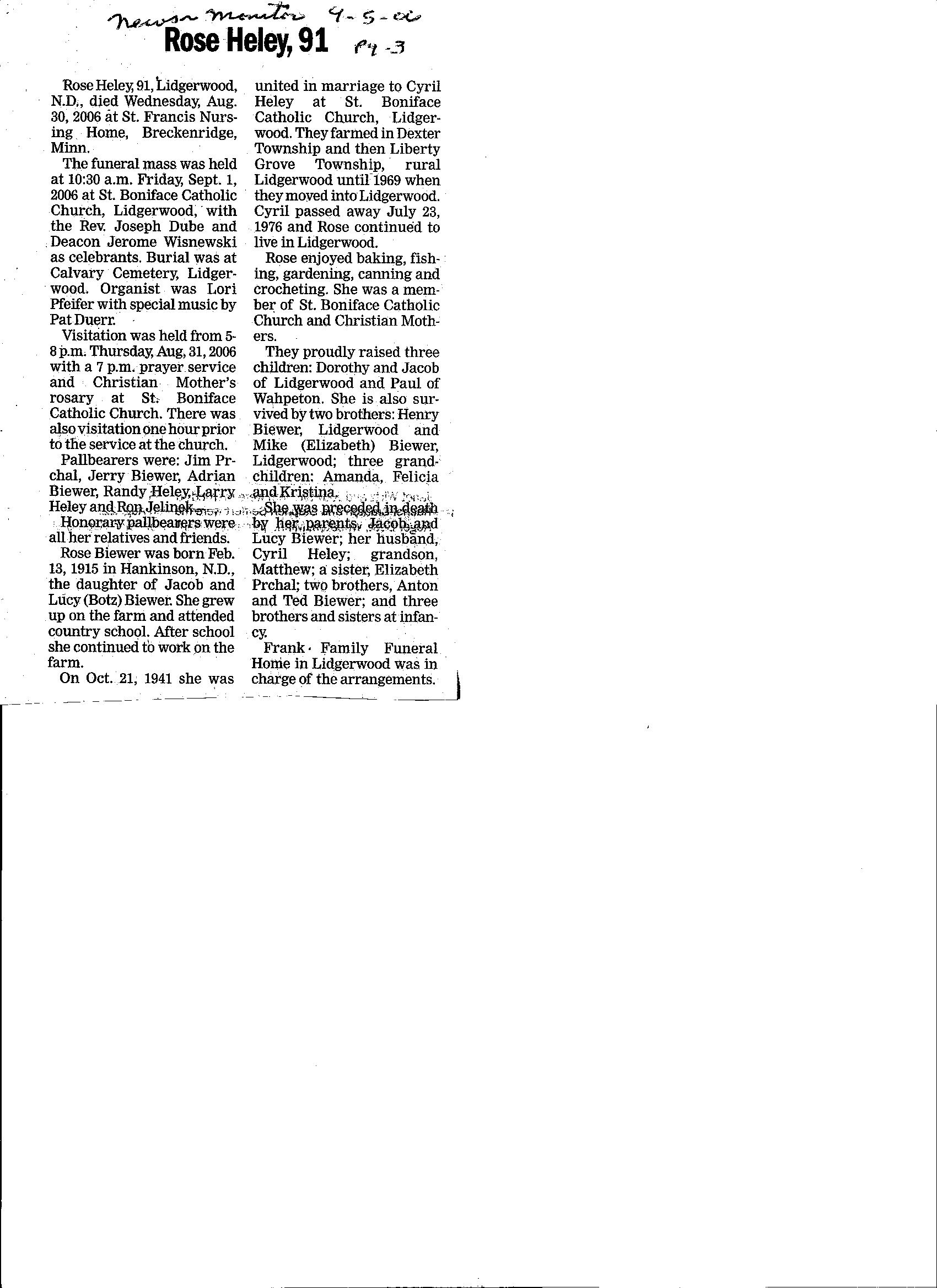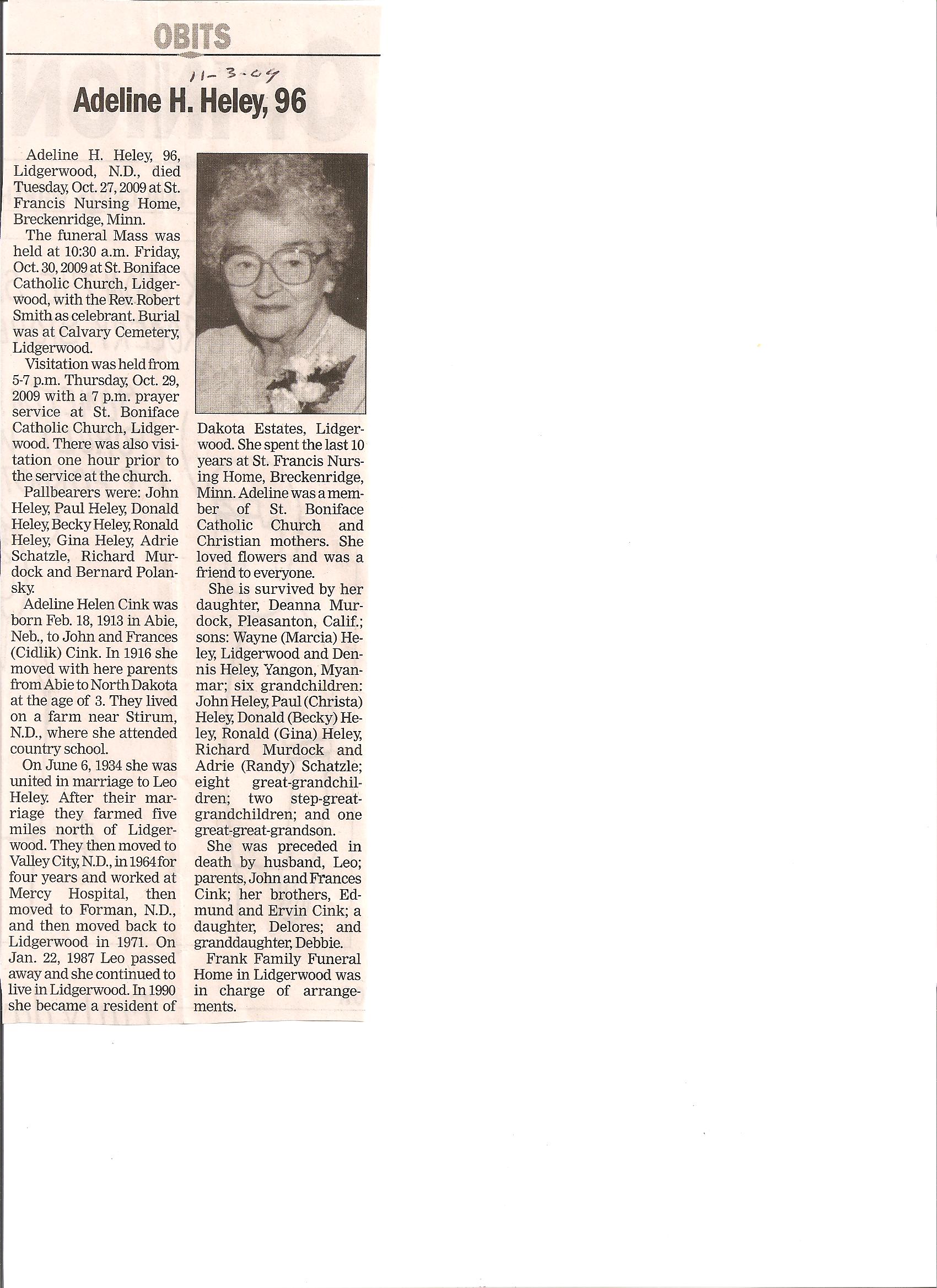 | HELEY, Adeline H., 96 | 1913/02/18 | 2009/09/27 | St. Francis Nursing Home, Breckenridge, MN | // | // | Obit | // |