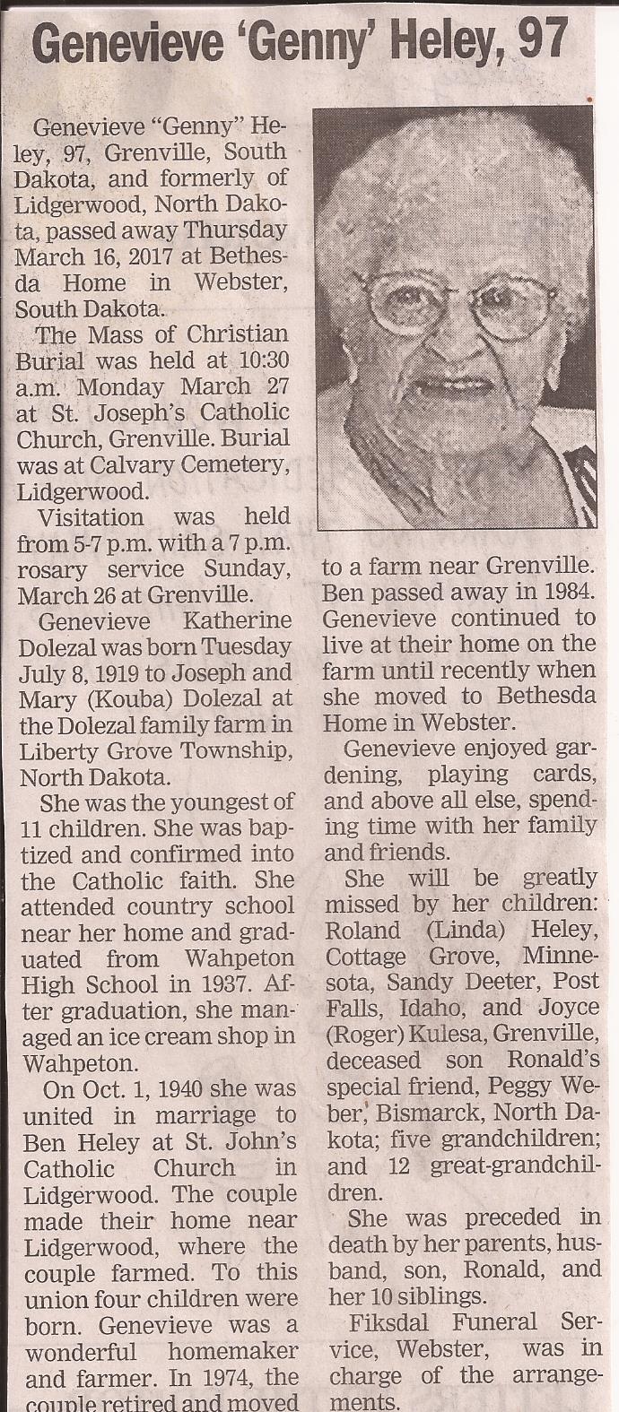 | HELEY (DOLEZAL), Genevieve "Genny' | 1919/07/08 | 2017/03/16 | // | // | // | Obit | |