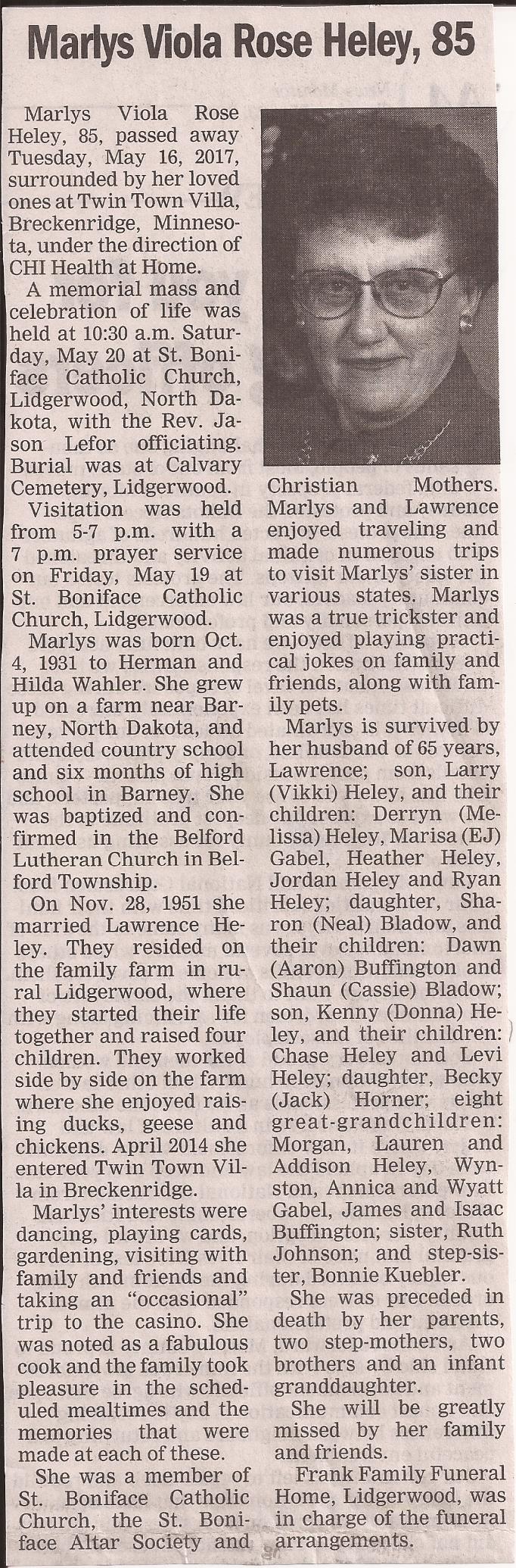 | HELEY (WAHLER), Marlys Viola Rose | 1931/10/04 | 2017/16/05 | Twin Town Villa, Breckenridge, MN | // | // | Obit | // |