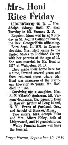 | HONL, Mary | 1872/09/28 | 1859/09/08 | Mt. Vernon, SD | Photo | Photo by James Honl | Obit | // |