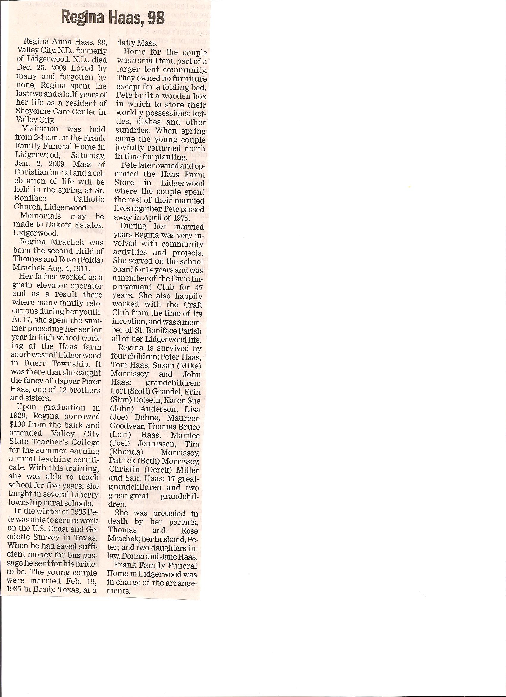 | HAAS, Regina, 98 | 1911/08/04 | 2009/12/25 | Sheyene Care Center, Valley City | // | // | Obit | // |