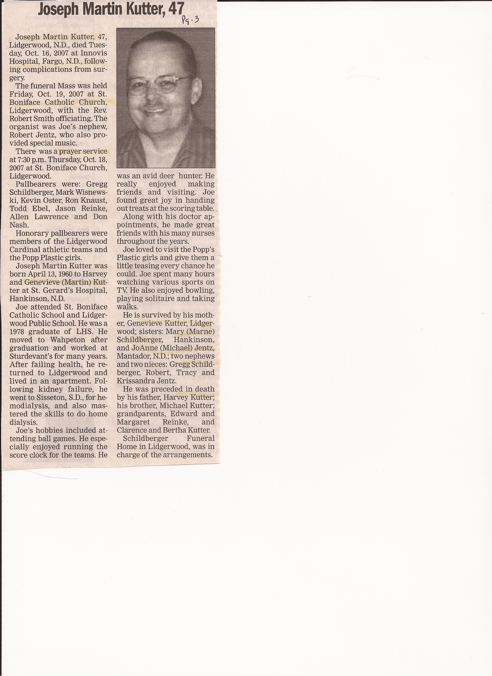 | KUTTER, Joseph Martin | 1960/04/13 | 2007/10/16 | Innovis Hospital, Fargo | // | // | Obit | // |