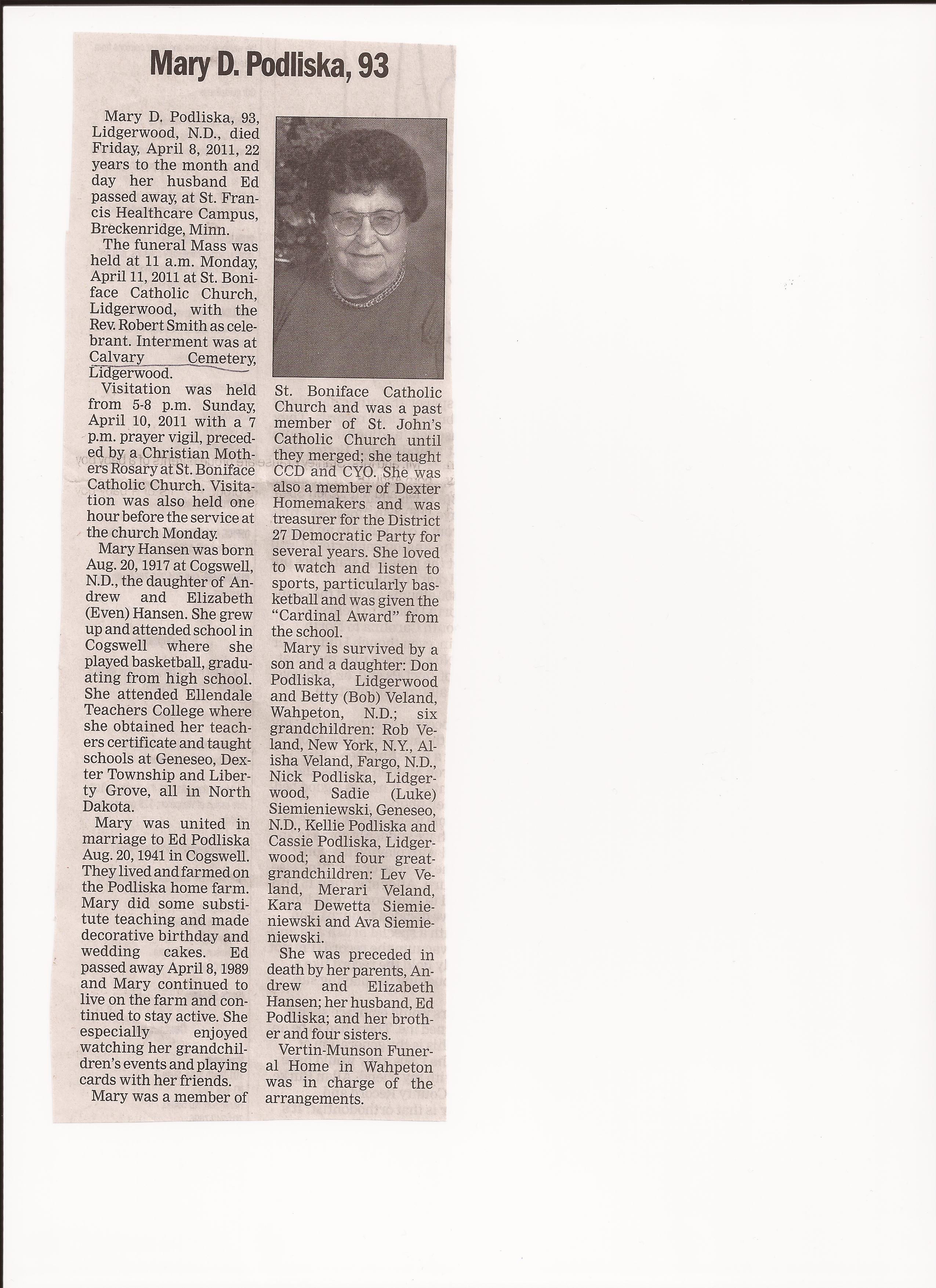 | PODLISKA, Mary D. | 1917/08/20 | 2011/04/08 | St. Francis Health Care, Breckenridge | // | // | Obit | // |