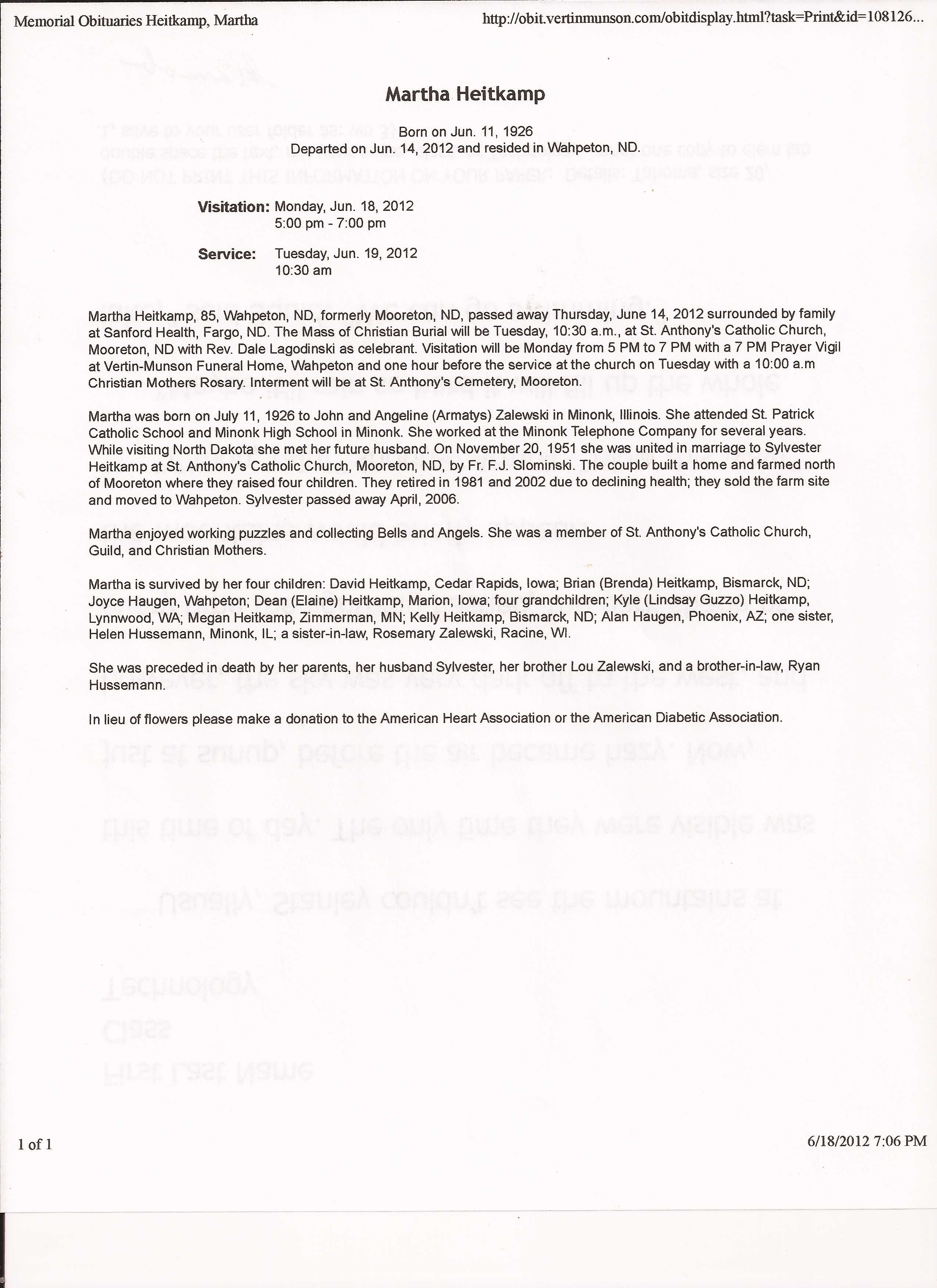 | HEITKAMP (ZALEWSKI), Martha | 1926/07/11 | 2012/06/14 | Obit |