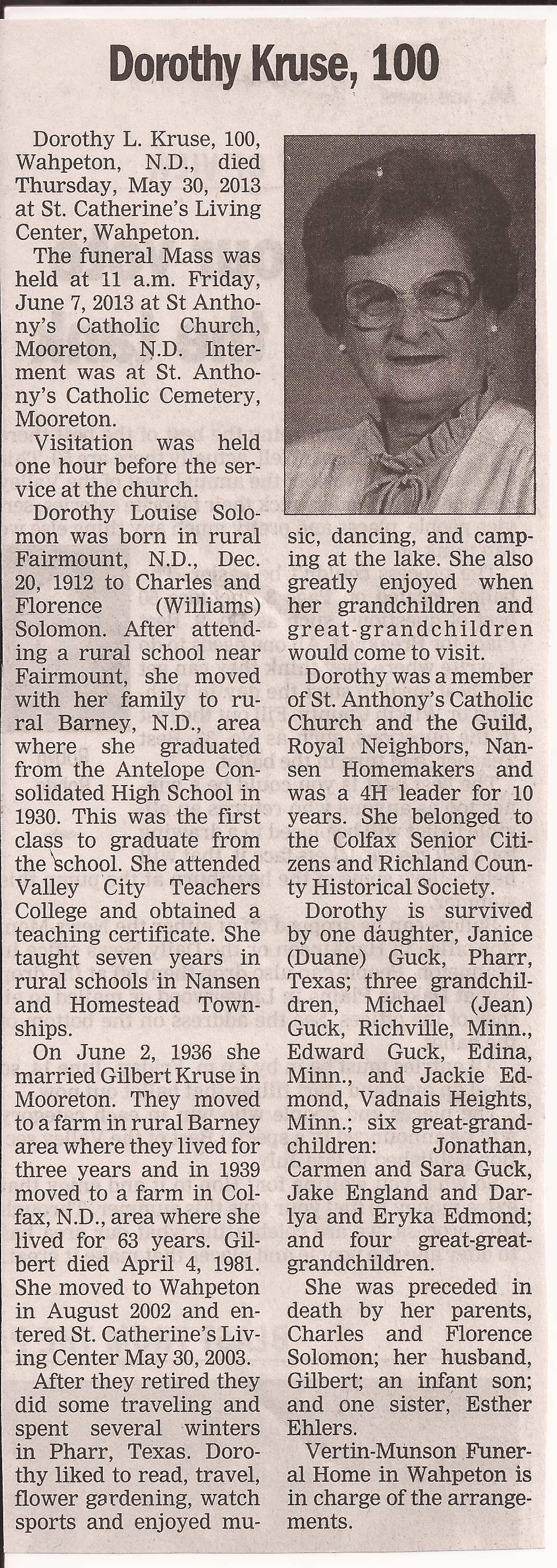 | KRUSE (SOLOMON), Dorothy Louise (Husband-Gilbert) | 1912/12/20 | 2013/06/30 | Obit |