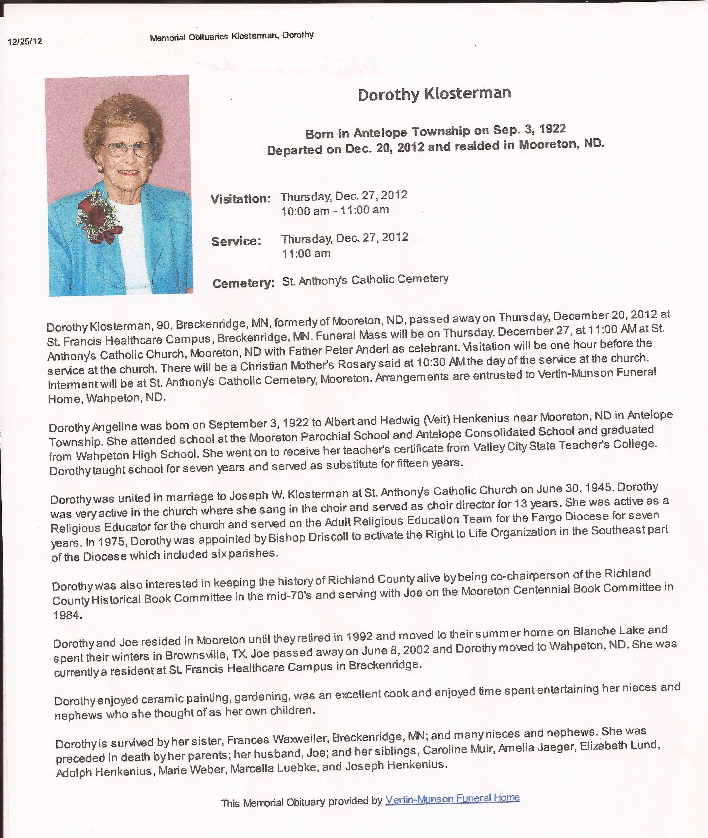 | KLOSTERMAN (HENKENIUS), Dorothy Angeline | 1922/09/03 | 2012/12/20 | Obit |