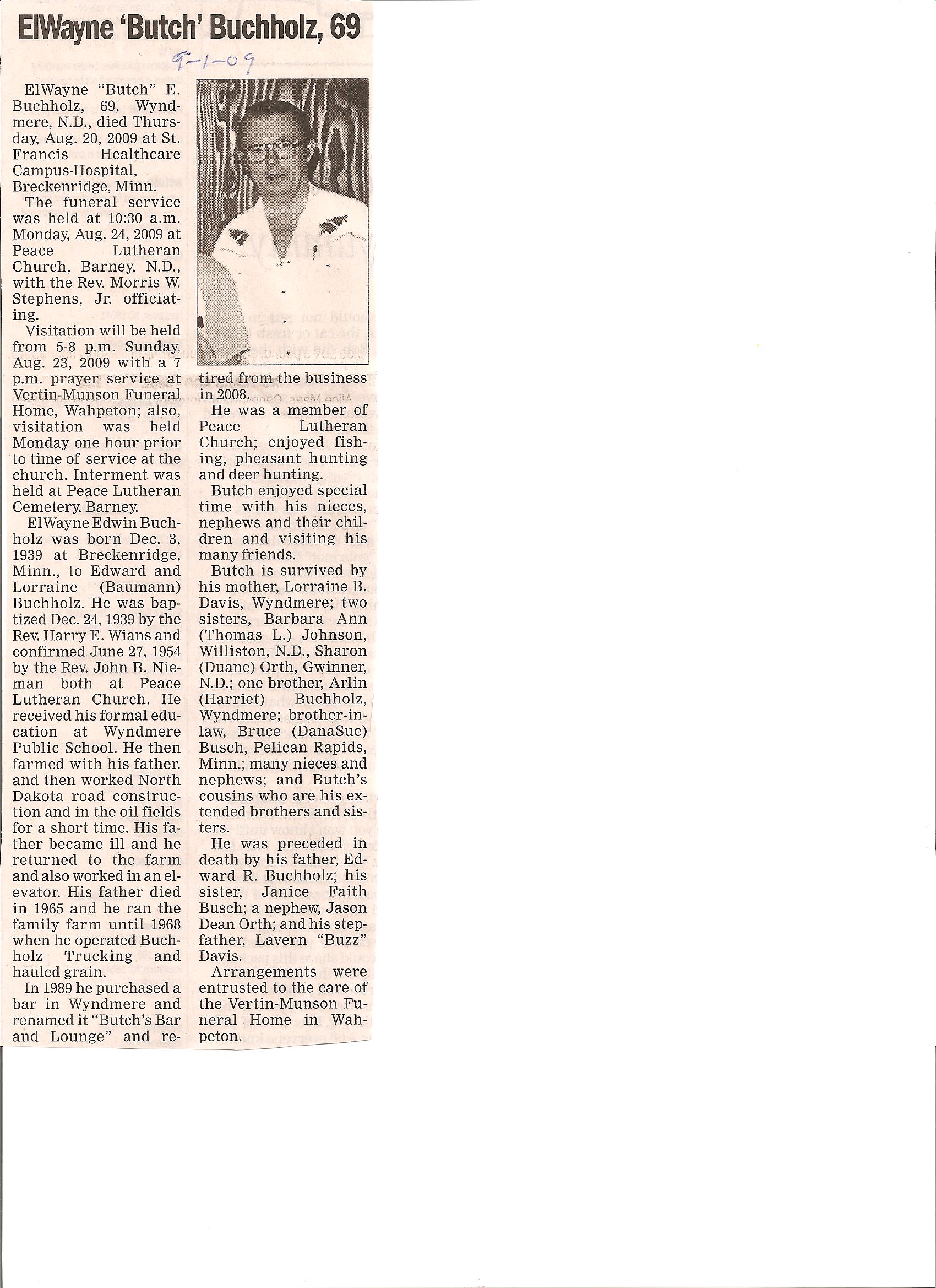 | // | BUCHHOLZ, ElWayne 'Butch' | Breckenridge, MN | 1939/12/03 | 2009/08/20 | Mother-Lorraine b. Davis | Obit |