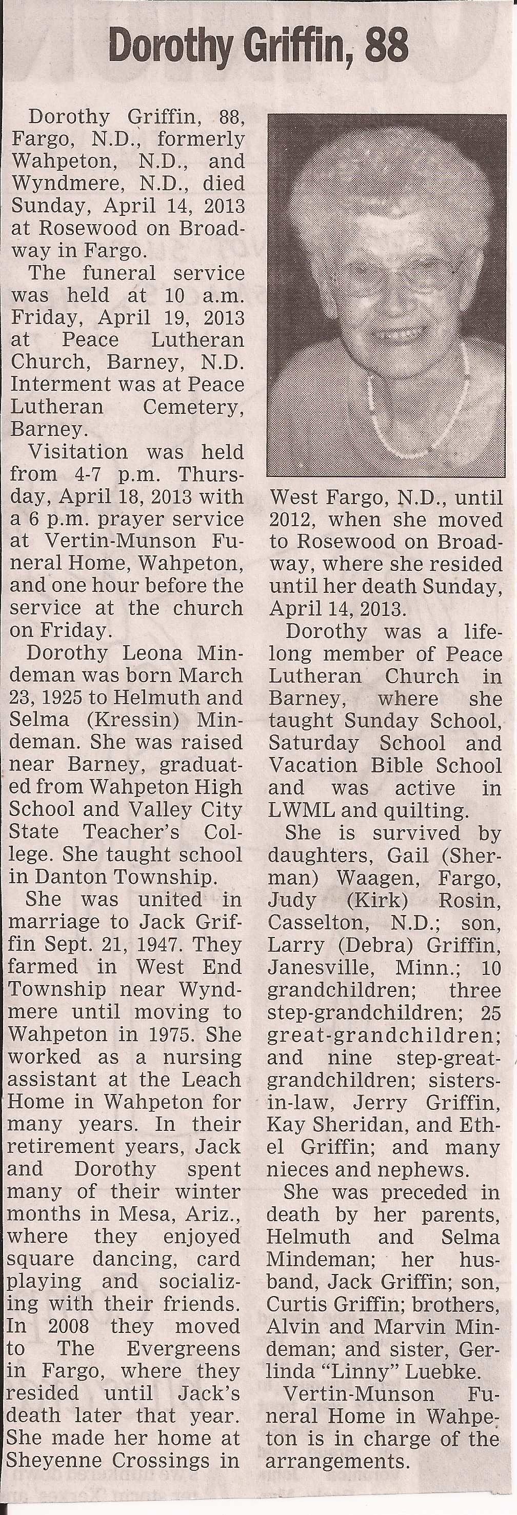 | // | GRIFFIN (MINDERMAN), Dorothy Leona | // | 1925/03/23 | 2013/04/14 | Daughters | Obit |