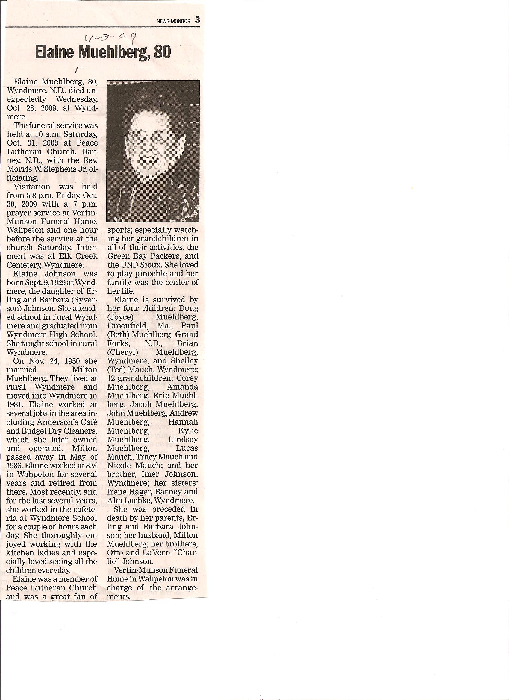 | // | MUEHLBERG, Elaine | // | 1929/09/09 | 2009/10/28 | // | Obit |