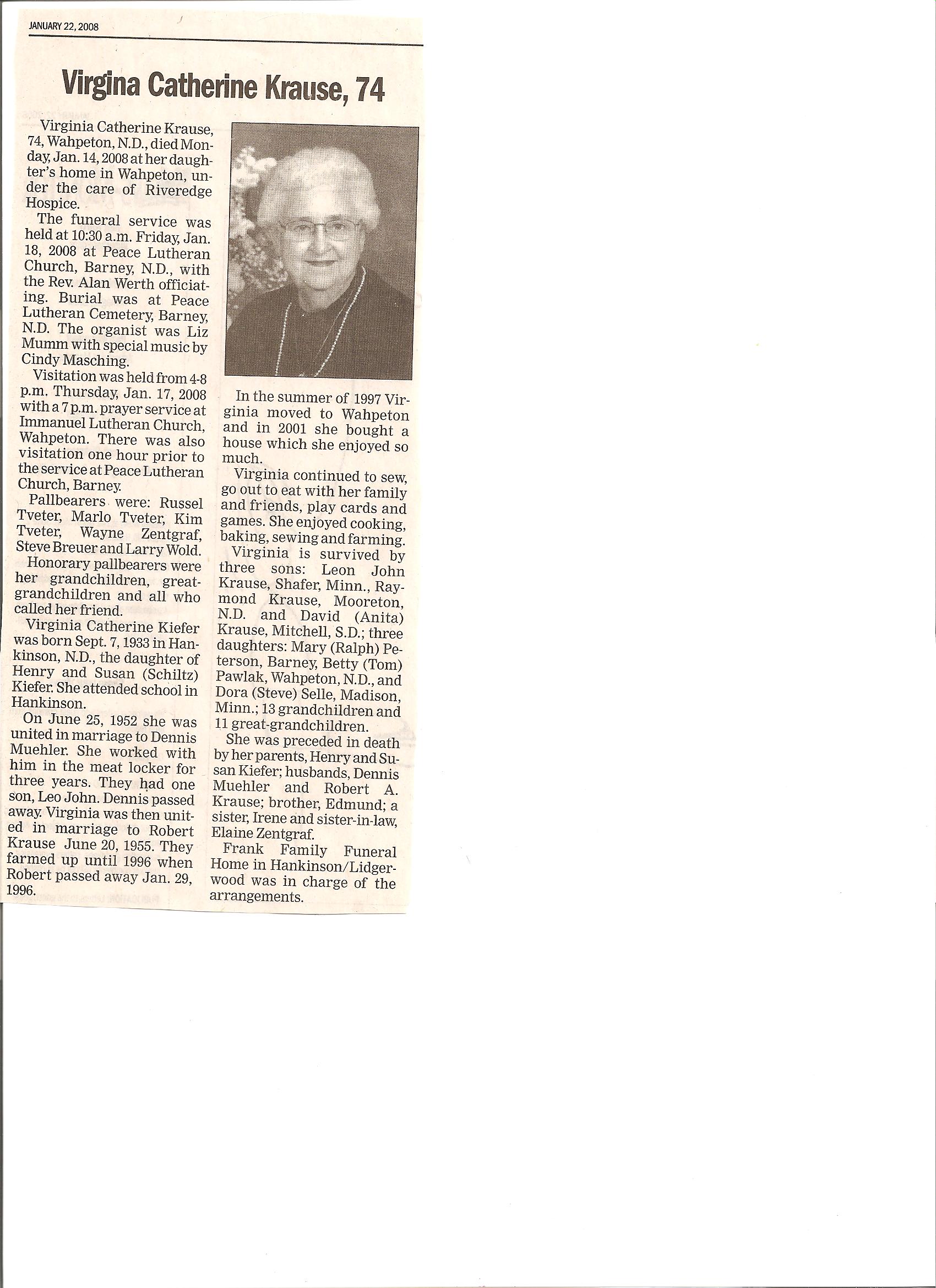 | // | KRAUSE, Virgina Catherine, 74 | Hankinson, ND | 1933/09/07 | 2008/01/14 | Preceded in death-Parents, Henry & Susan Kiefer, husbands-Dennis Muehler & Robert A. Krause,Edmund (brother), Irene (sister), Elaine Zentgraf (sister-in-law): living 3 sons: Leon John, raymond, David; 3 daughters Mary Peterson, Betty Pawlak, Dora Selle. | Obit |