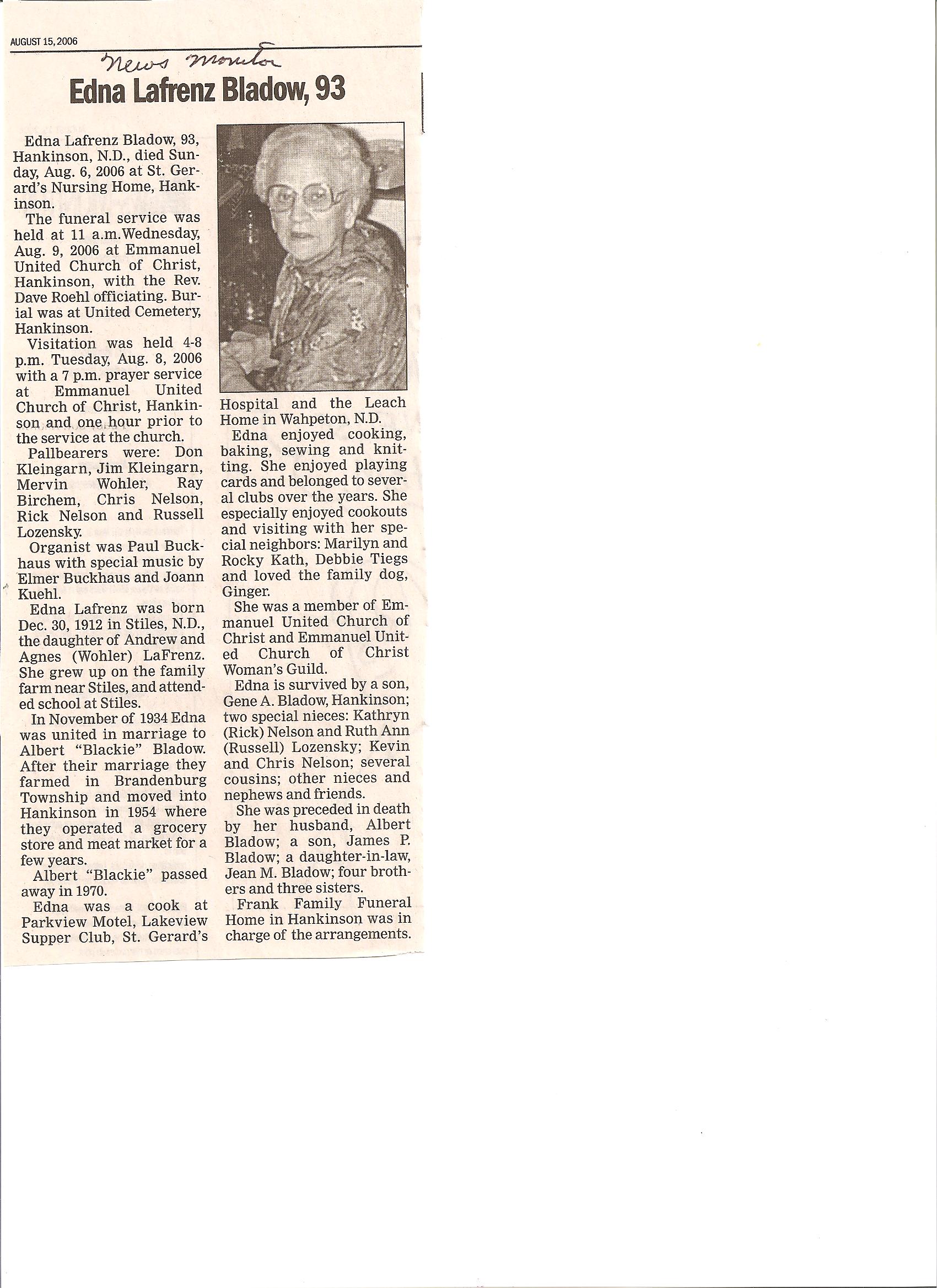 | BLADOW, Albert H. BLADOW (LAFRENZ), Edna | 1901/11/09 1912/12/03 | 1970/05/-- 2006/08/06 | Photo* | // | Obit | |