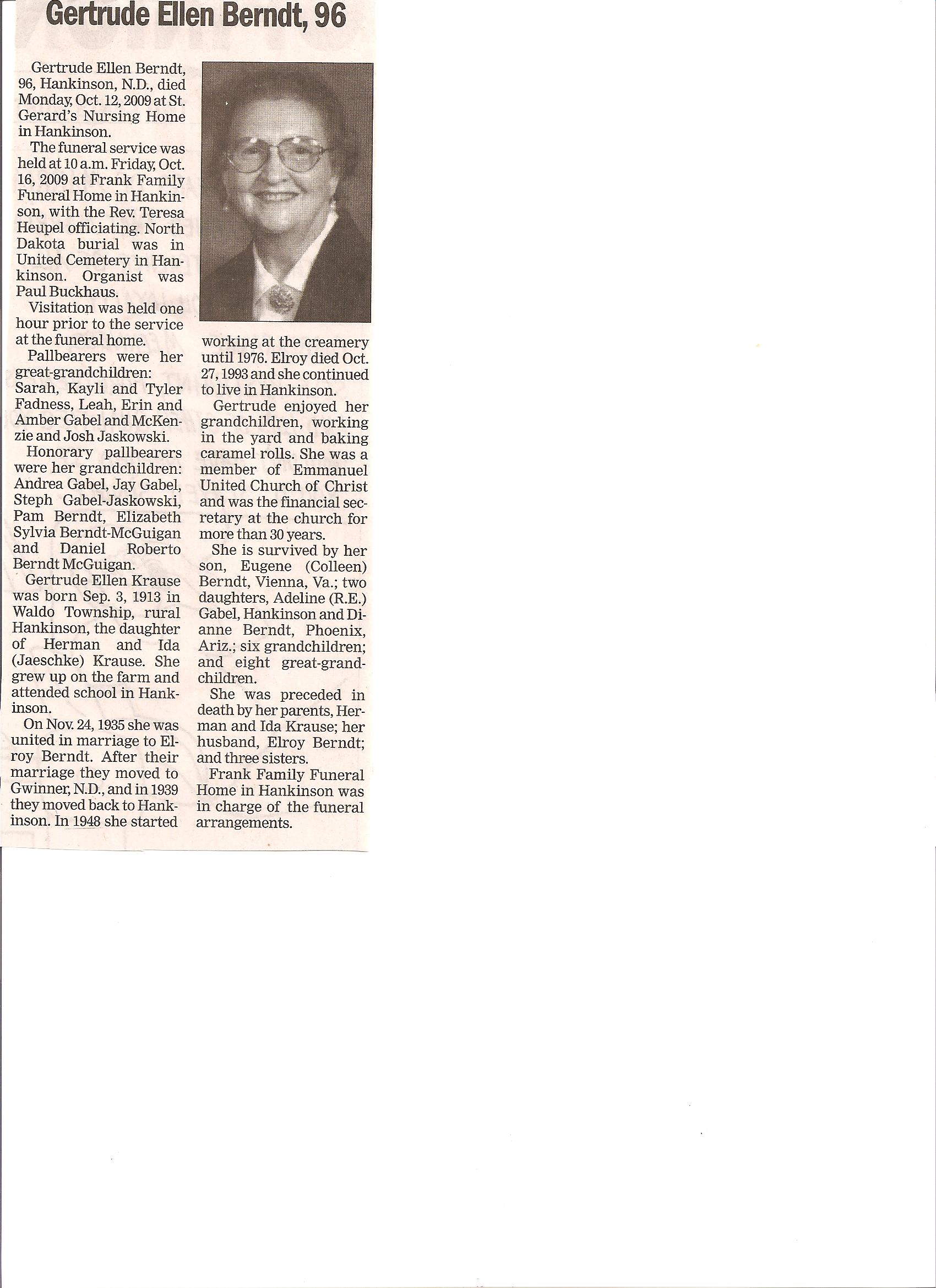 | BERNDT, Gertrude Ellen | 1913/09/03 | 2009/10/12 | // | // | Obit | |
