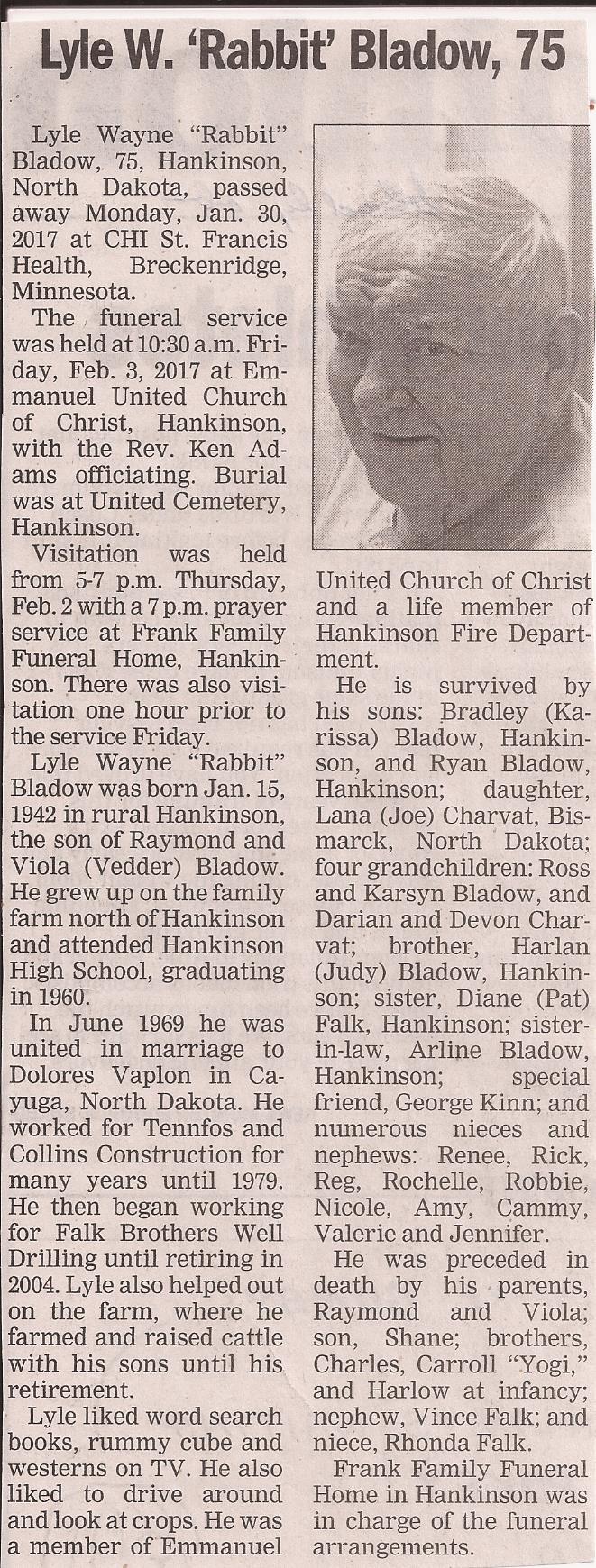 | BLADOW, Lyle Wayne Mar. VAPLON, Delores in 1969 Father of Shane, Lana, Brad, Ryan | 1942/01/05 | 2017/01/30 | Photo | // | Obit | |
