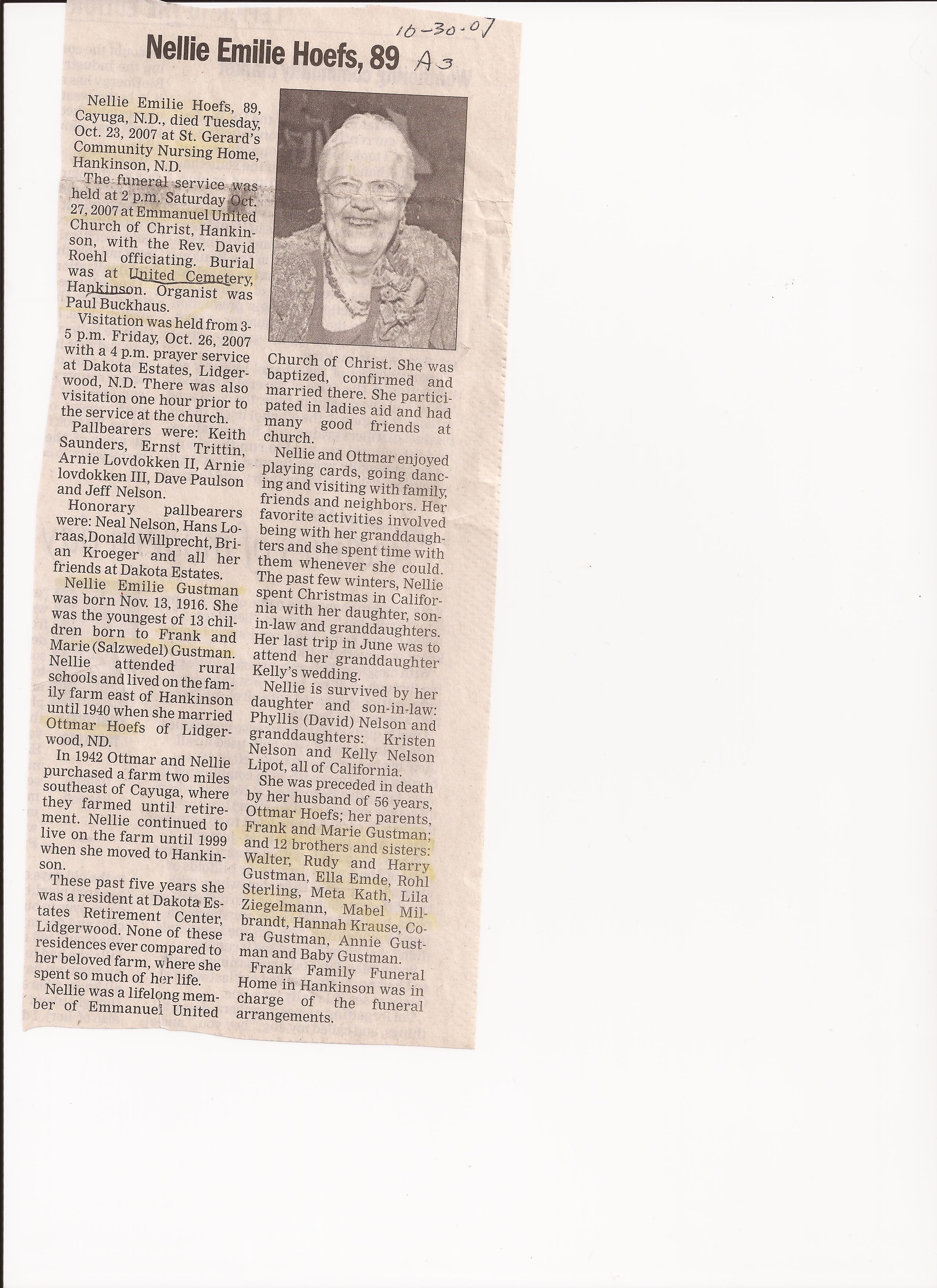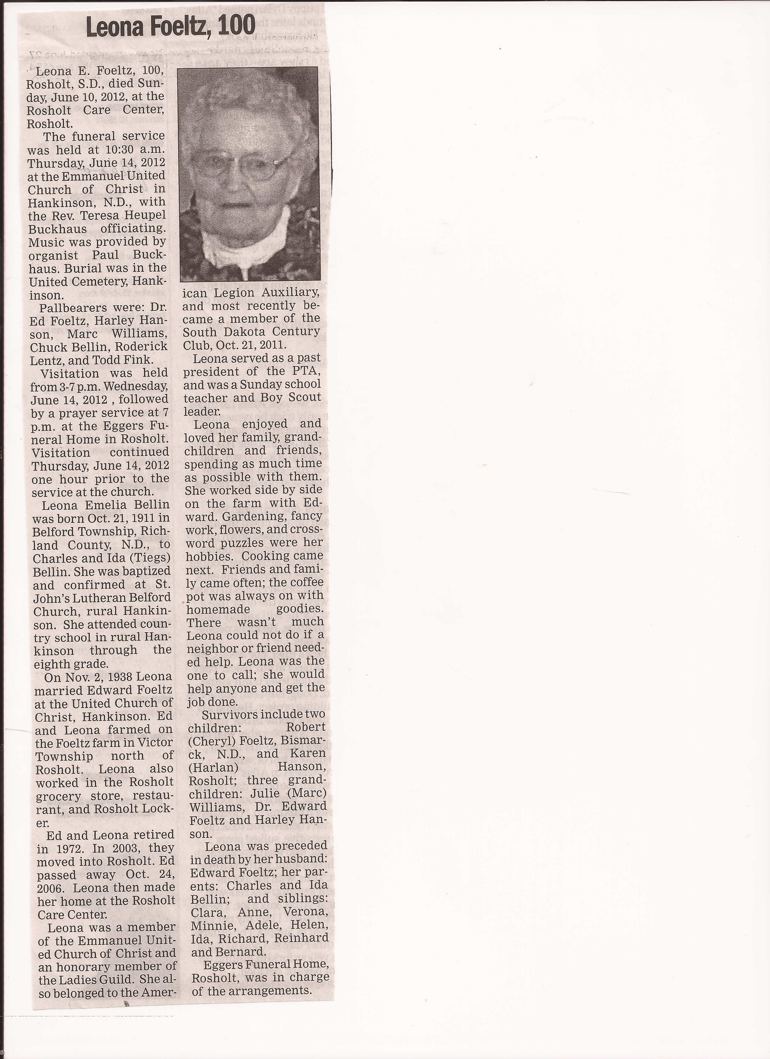 | FOELTZ (BELLIN), Leona Emelia | 1911/10/21 | 2012/06/10 | // | // | Obit | |
