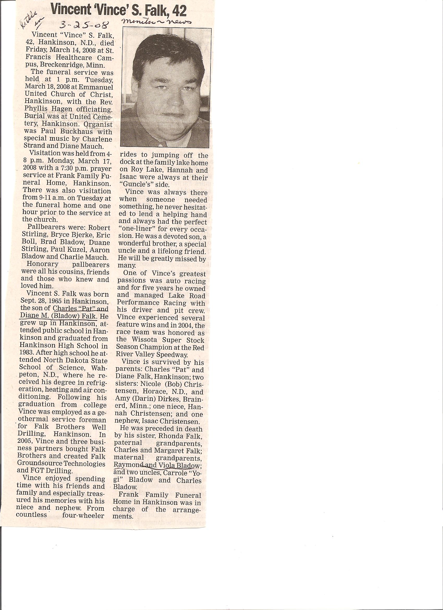 | FALK, Vincent 'Vince' S. | 1965/09/28 | 2008/03/14 | // | // | Obit | |