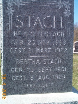 | STACH, Heinrich STACH, Bertha | 1868/11/23 1861/09/20 | 1922/03/21 1929/08/03 | Photo | // | // | |