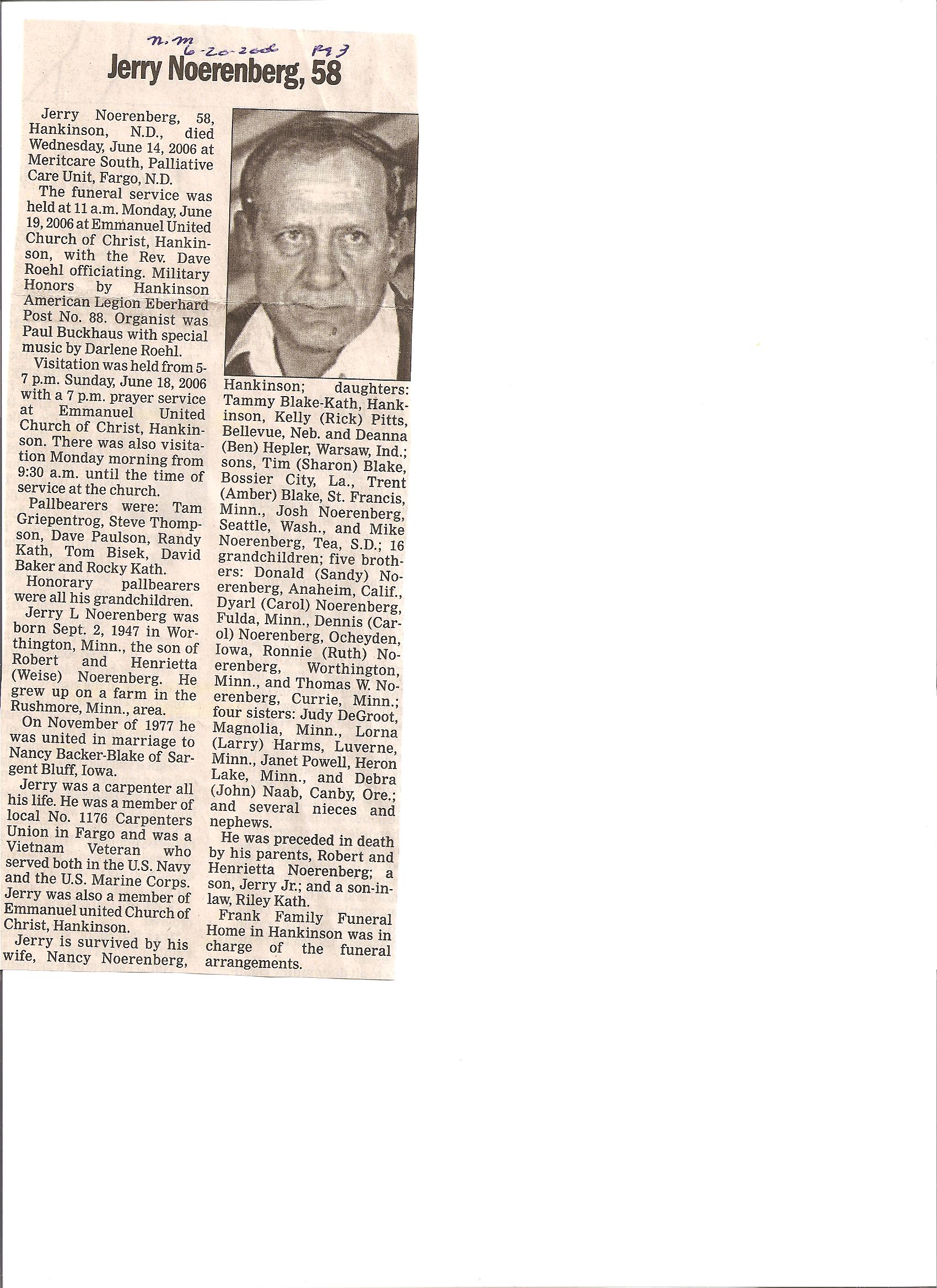 | NOERENBERG, Jerry L. | 1947/09/02 | 2006/06/14 | // | // | Obit | |