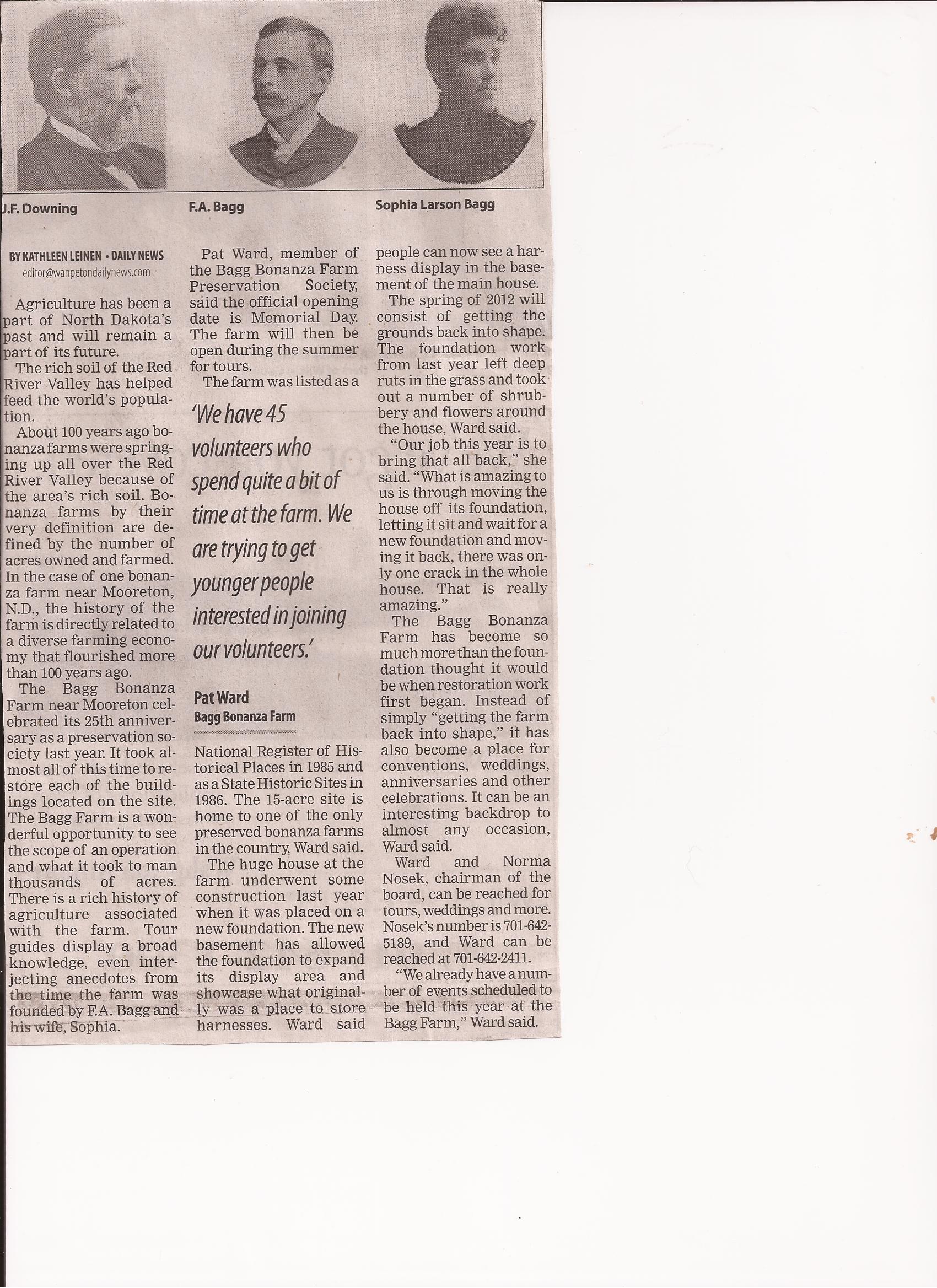 Hiram N. Drache, in his book 'The Day of the Bonanza' writes: Best known of all the bonanzas in Richland County was the Dwight Farm, owned by the Dwight Farm & Land Company, headed by Congressman John W. Dwight of Dryden, New York. It had twelve stockholders, two of them being Charles Cady and John Miller, both of whom were superintendents, and became later political leaders in North Dakota. John Miller, who became North Dakota's first governor, became the farm president in 1896. Purchases from the railroad amounted to 17,000 acres scattered throughout 9 townships, until a total of 27,000 acres were secured. An additional 32,000 acres were secured in the Finley area of Steele County, making a total of 60,000 acres.